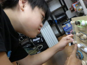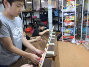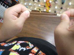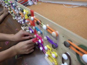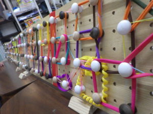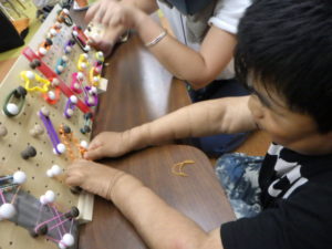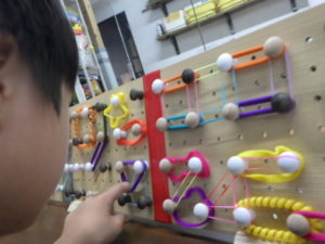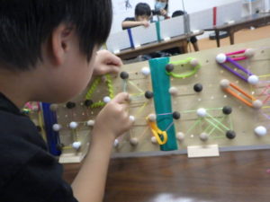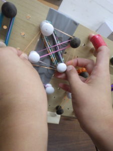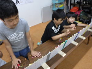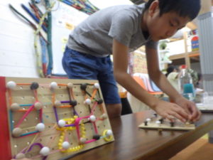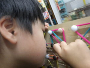 最初は2つ横にゴムをかけてたR君も徐々に色んな形に変化させていきます!