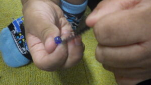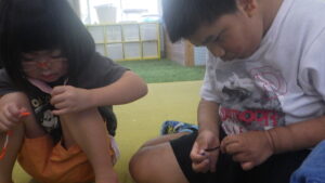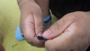 最初の頃はモールにビーズを通す事が出来なかったA君ですが、(Thread the string ①を参照ください)