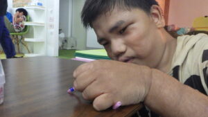 最近のA君は、私が準備をしていると、自分からその場に座り、やろうとしてくれるのですが、集中力がきれちゃう事も多くて、本人のペースをみながら、ゆっくり、ゆっくり取り組んでいます。