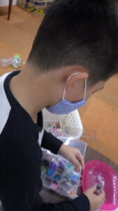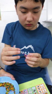 最初は‟通す”事が苦手だったP君も、今では、ワイヤーにビーズを決められた色の数だけ、すいすい通していきます♪